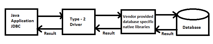 Here the type 2 driver used to convert Java application call for Native-API call and database directly understand the call of Native-API Driver call.
